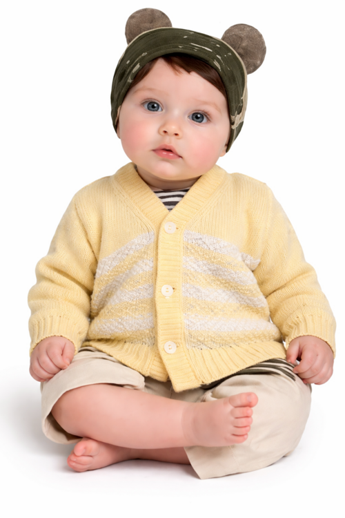 Adorable Baby in Bear Hat and Yellow Cardigan